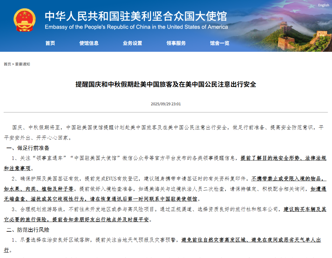 駐美國使館提醒國慶中秋赴美旅客及在美中國公民:行前關注官方安全提醒,確保護照簽證及EVUS登記有效,隨身攜帶簽證材料副本,避免攜帶違禁品,配合海關檢查,選擇正規旅行社及保險,避開高風險區域,出行時注意治安及天氣,遵守交規,防范盜竊,并提前告知親朋好友出行地點,及時報平安。