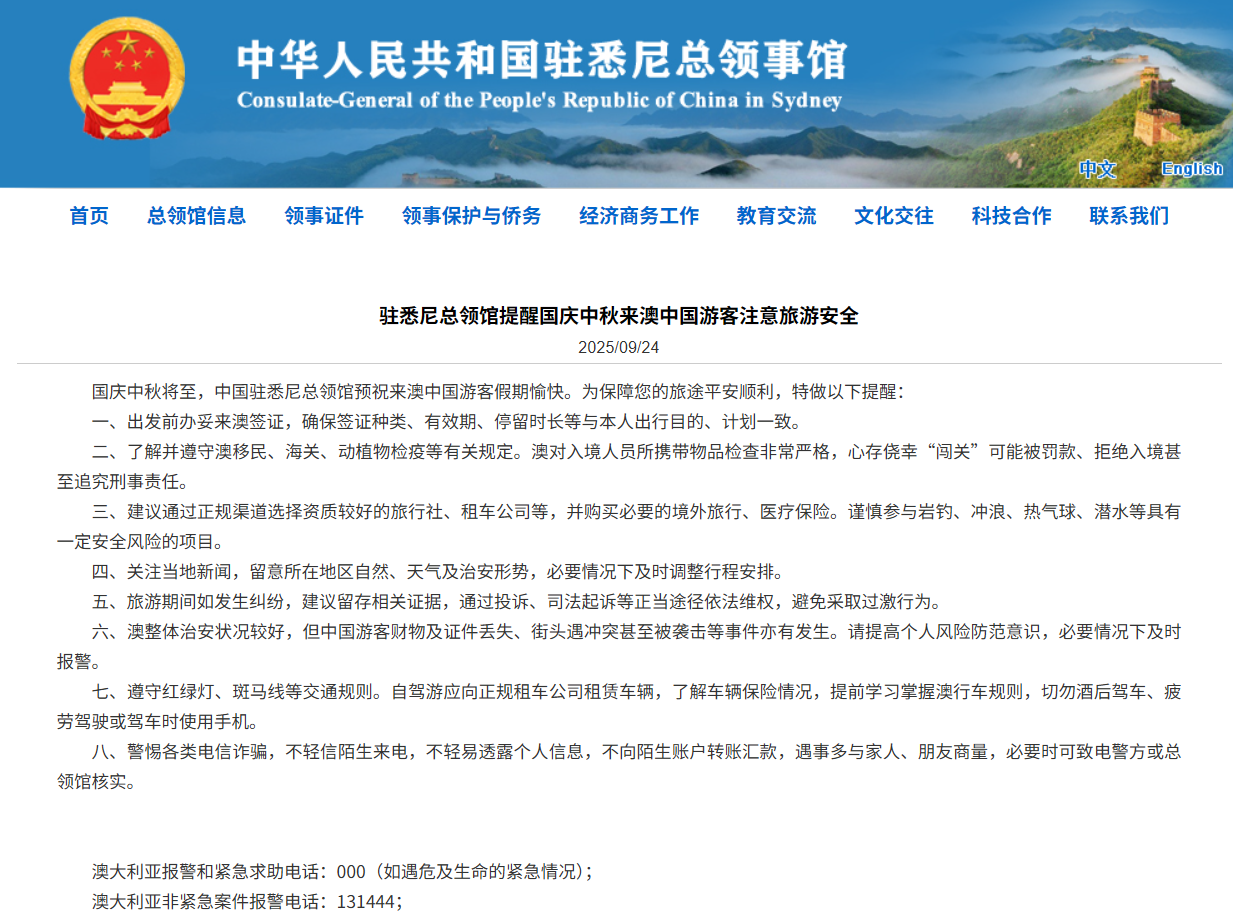 中國駐悉尼總領館:提醒國慶中秋來澳中國公民注意旅游安全