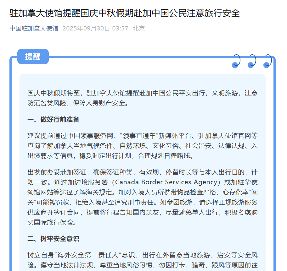 中國駐加拿大使館:提醒假期赴加中國公民注意旅行安全
