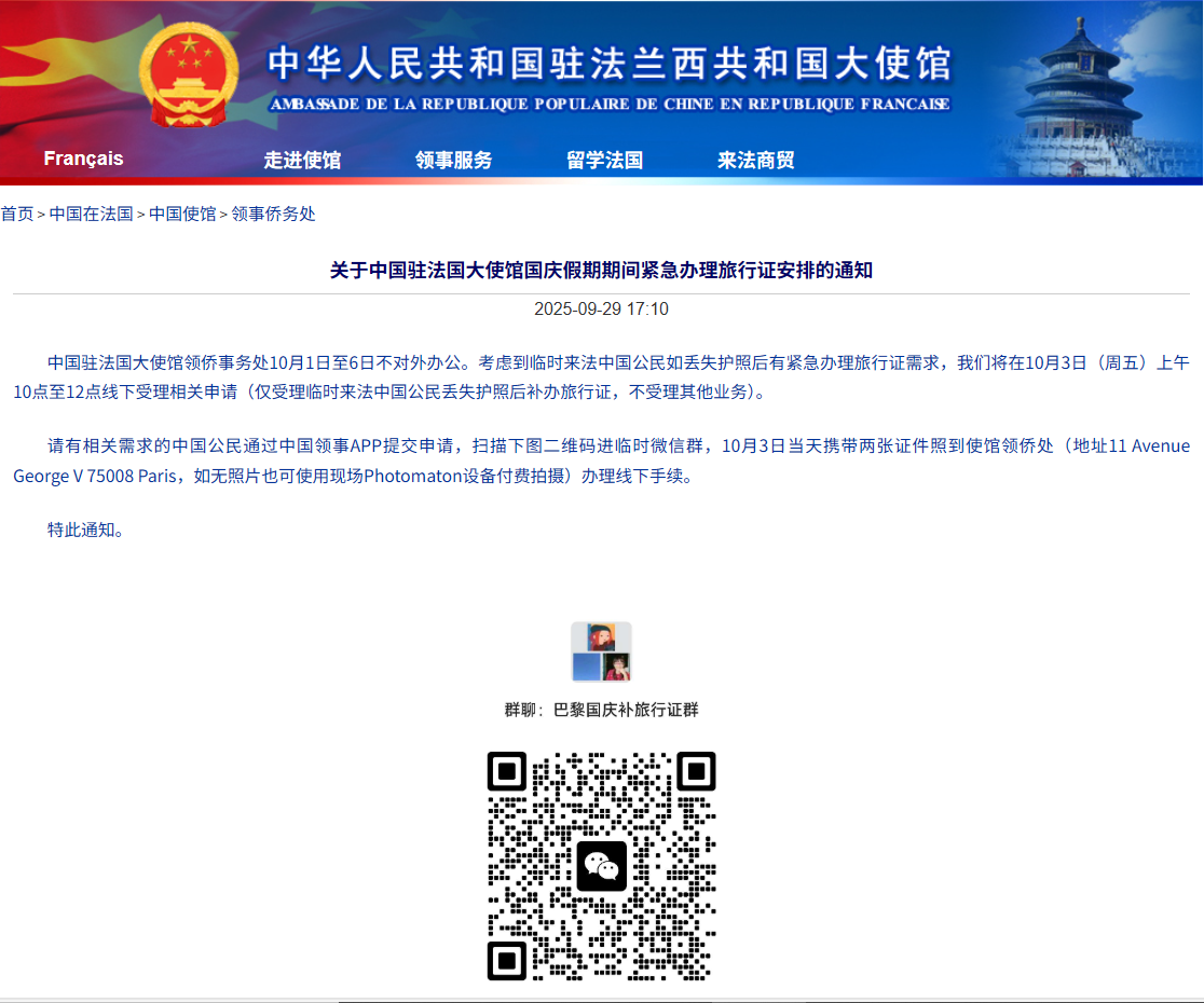 中國駐法國大使館:發布國慶假期期間緊急辦理旅行證安排的通知