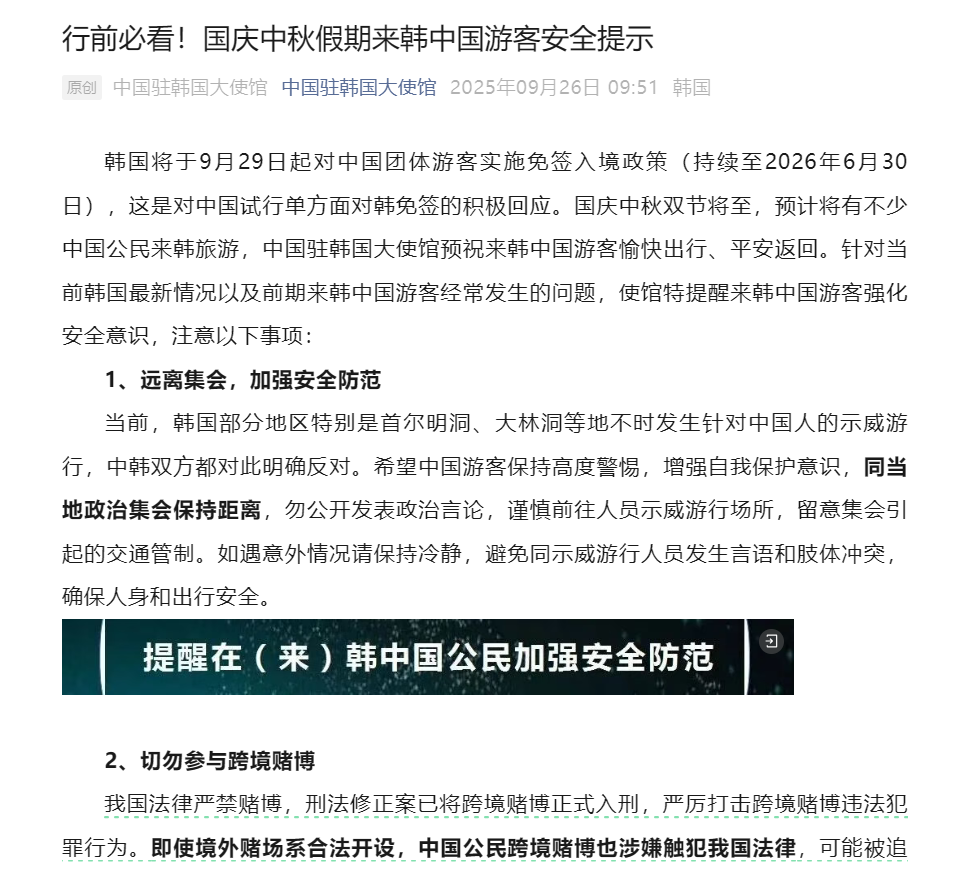 中國駐韓國大使館:行前必看!國慶中秋假期來韓中國公民安全提示