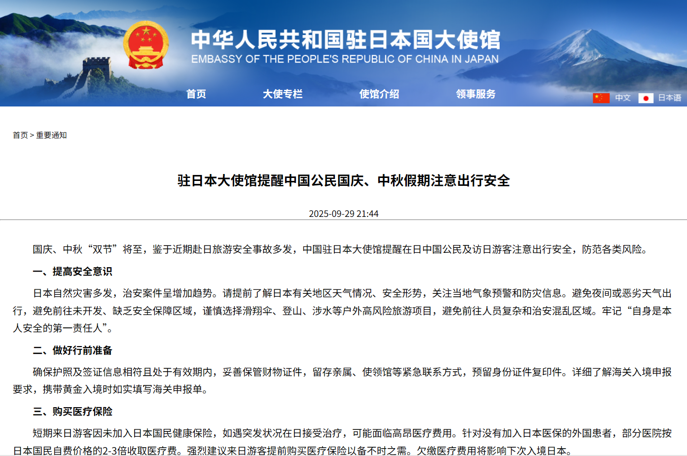 日本自然災害多發,治安案件呈增加趨勢,駐日本使館提醒在日中國公民提前了解天氣和安全形勢,關注氣象預警和防災信息,避免夜間或惡劣天氣出行,謹慎選擇高風險旅游項目,遠離選舉集會、游行示威人群,避免前往敏感地區和人員密集場所,如遇針對性歧視和糾紛保持冷靜,妥善應對,避免肢體沖突,確保人身安全,注意保存證據,如遇緊急情況,及時向日本警方報案并留存回執。