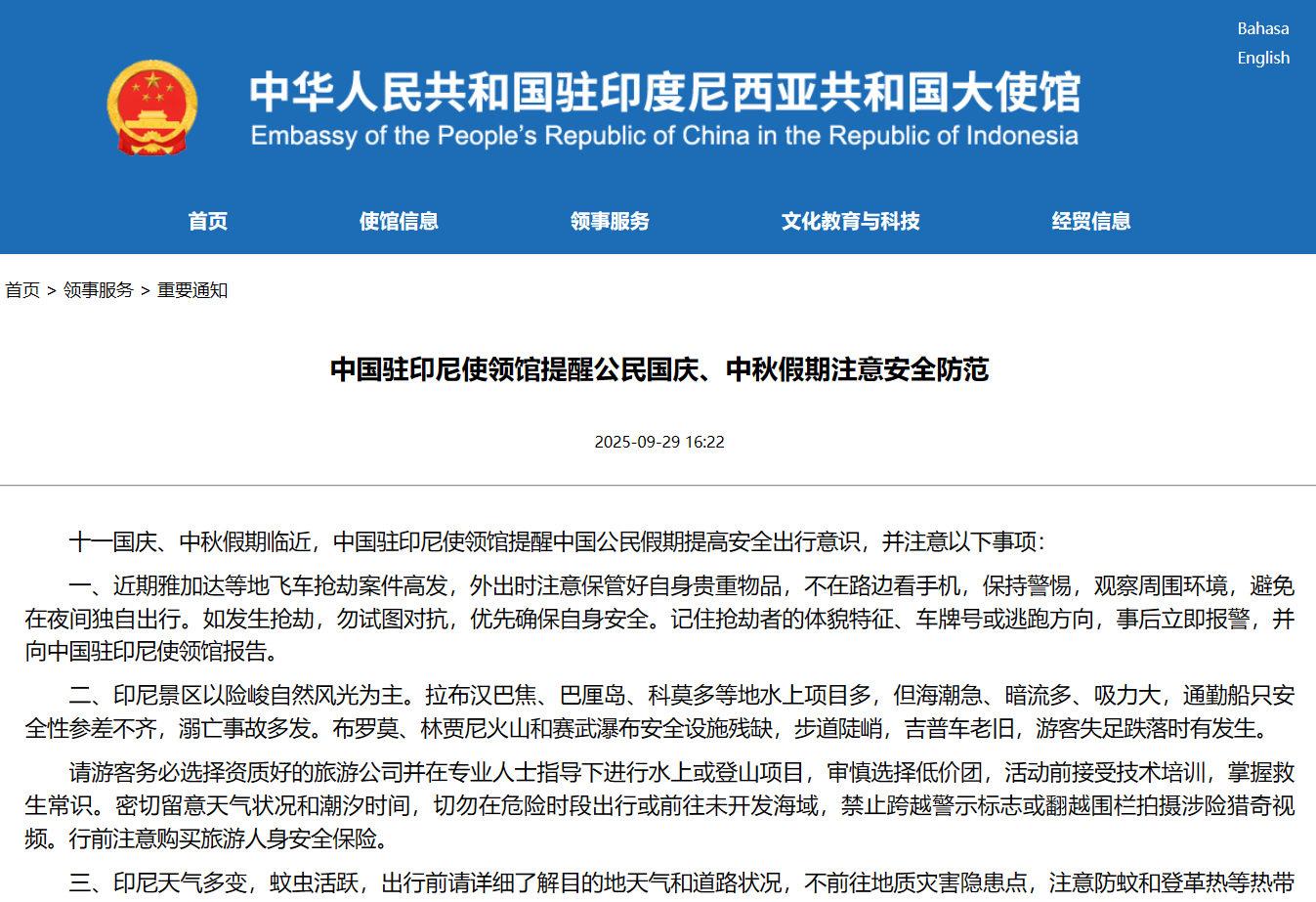 中國駐印尼大使館:發布國慶、中秋假期安全提醒