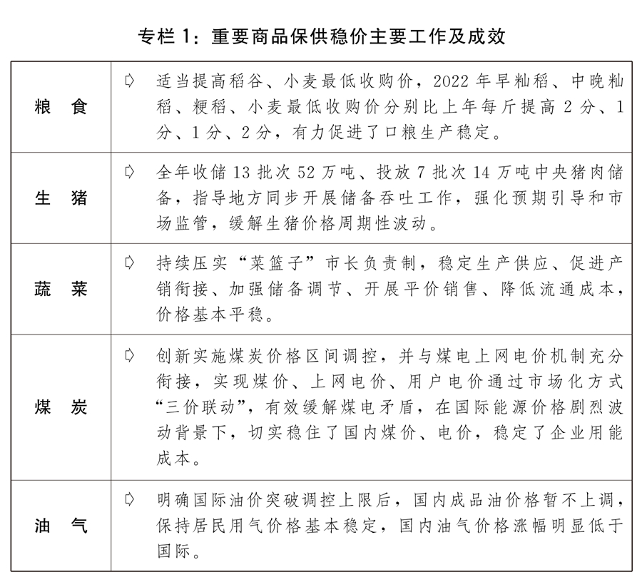 三是重要商品保供穩(wěn)價(jià)進(jìn)一步加強(qiáng)。推進(jìn)重要民生商品價(jià)格調(diào)控機(jī)制落地見(jiàn)效,加強(qiáng)產(chǎn)運(yùn)銷(xiāo)銜接和進(jìn)出口、儲(chǔ)備吞吐調(diào)節(jié),強(qiáng)化預(yù)期引導(dǎo),促進(jìn)價(jià)格平穩(wěn)運(yùn)行。堅(jiān)持糧食最低收購(gòu)價(jià)政策托底定位,適當(dāng)提高稻谷、小麥最低收購(gòu)價(jià),穩(wěn)定口糧生產(chǎn)。壓實(shí)“菜籃子”市長(zhǎng)負(fù)責(zé)制,加強(qiáng)生豬市場(chǎng)調(diào)控,緩解生豬豬肉價(jià)格大幅波動(dòng)。規(guī)范價(jià)格指數(shù)行為,期貨現(xiàn)貨市場(chǎng)聯(lián)動(dòng)監(jiān)管明顯加強(qiáng)。創(chuàng)新構(gòu)建煤炭?jī)r(jià)格調(diào)控監(jiān)管長(zhǎng)效機(jī)制,引導(dǎo)煤炭?jī)r(jià)格在合理區(qū)間運(yùn)行,積極應(yīng)對(duì)國(guó)際油氣價(jià)格大幅上漲,保障居民用電用氣需求和價(jià)格穩(wěn)定。