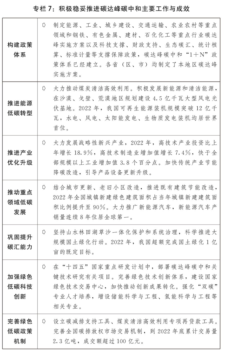 二是碳達(dá)峰碳中和積極穩(wěn)妥推進(jìn)。碳達(dá)峰碳中和“1+N”政策體系構(gòu)建完成,重點(diǎn)領(lǐng)域碳達(dá)峰實(shí)施方案和配套保障措施制定出臺(tái),“碳達(dá)峰十大行動(dòng)”扎實(shí)推進(jìn)。全國(guó)碳排放權(quán)交易市場(chǎng)平穩(wěn)運(yùn)行。堅(jiān)持“先立后改”,加快建設(shè)先進(jìn)清潔支撐性煤電,推動(dòng)煤電機(jī)組節(jié)能降碳改造、靈活性改造、供熱改造“三改聯(lián)動(dòng)”,積極發(fā)展新能源和清潔能源,第一批以沙漠、戈壁、荒漠地區(qū)為重點(diǎn)的大型風(fēng)電光伏基地加快建設(shè),我國(guó)可再生能源總裝機(jī)突破12億千瓦。重點(diǎn)行業(yè)節(jié)能降碳大力推進(jìn),提高新建建筑節(jié)能水平,積極發(fā)展綠色建筑,大力推廣新能源汽車(chē),持續(xù)推動(dòng)充電基礎(chǔ)設(shè)施建設(shè),加快推進(jìn)大宗貨物和中長(zhǎng)距離貨物運(yùn)輸“公轉(zhuǎn)鐵”、“公轉(zhuǎn)水”。單位國(guó)內(nèi)生產(chǎn)總值二氧化碳排放下降0.8%。積極參與聯(lián)合國(guó)氣候變化沙姆沙伊赫大會(huì)各項(xiàng)談判磋商,推動(dòng)大會(huì)取得積極成果。