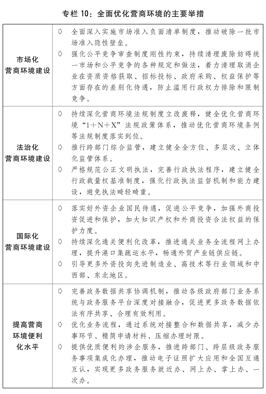 三是營(yíng)造市場(chǎng)化法治化國(guó)際化一流營(yíng)商環(huán)境。深化簡(jiǎn)政放權(quán)、放管結(jié)合、優(yōu)化服務(wù)改革。堅(jiān)持依法行政,嚴(yán)格規(guī)范公正文明執(zhí)法,帶頭遵守契約,提高政府公信力和執(zhí)行力。強(qiáng)化公平競(jìng)爭(zhēng)審查制度剛性約束,持續(xù)清理修改不符合優(yōu)化營(yíng)商環(huán)境條例的規(guī)章和規(guī)范性文件,推動(dòng)各地結(jié)合實(shí)際出臺(tái)配套政策措施,促進(jìn)全國(guó)范圍營(yíng)商環(huán)境持續(xù)改善。深化營(yíng)商環(huán)境創(chuàng)新試點(diǎn),支持有條件的地方率先加大營(yíng)商環(huán)境改革力度。不斷優(yōu)化中國(guó)營(yíng)商環(huán)境評(píng)價(jià)體系,健全中國(guó)營(yíng)商環(huán)境評(píng)價(jià)長(zhǎng)效機(jī)制。制定進(jìn)一步提升重點(diǎn)區(qū)域、工業(yè)園區(qū)等營(yíng)商環(huán)境水平的行動(dòng)方案,推動(dòng)城市群、都市圈等重點(diǎn)區(qū)域營(yíng)商環(huán)境一體化發(fā)展。推動(dòng)建立涉企收費(fèi)長(zhǎng)效監(jiān)管機(jī)制。充分發(fā)揮全國(guó)一體化政務(wù)服務(wù)平臺(tái)“一網(wǎng)通辦”樞紐作用,深入推進(jìn)“一件事一次辦”改革舉措,加快電子證照應(yīng)用,持續(xù)提升政務(wù)服務(wù)“跨省通辦”質(zhì)效。建立企業(yè)信用狀況綜合評(píng)價(jià)體系,強(qiáng)化企業(yè)信用風(fēng)險(xiǎn)分類管理,完善社會(huì)信用統(tǒng)一代碼制度,加強(qiáng)信用信息共享應(yīng)用,促進(jìn)中小微企業(yè)融資便利。